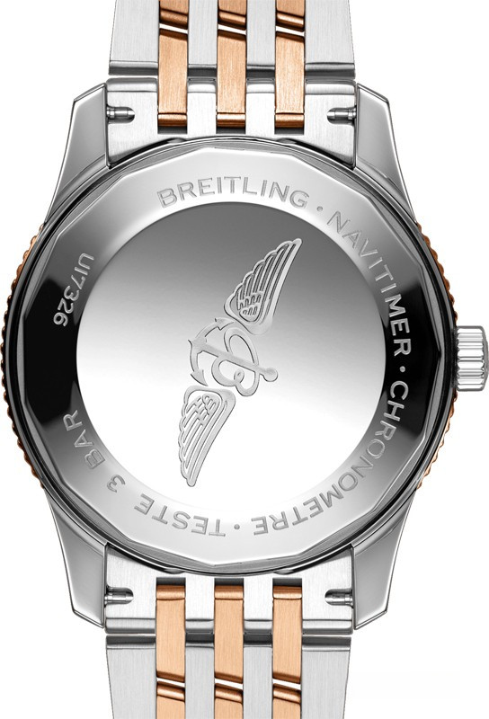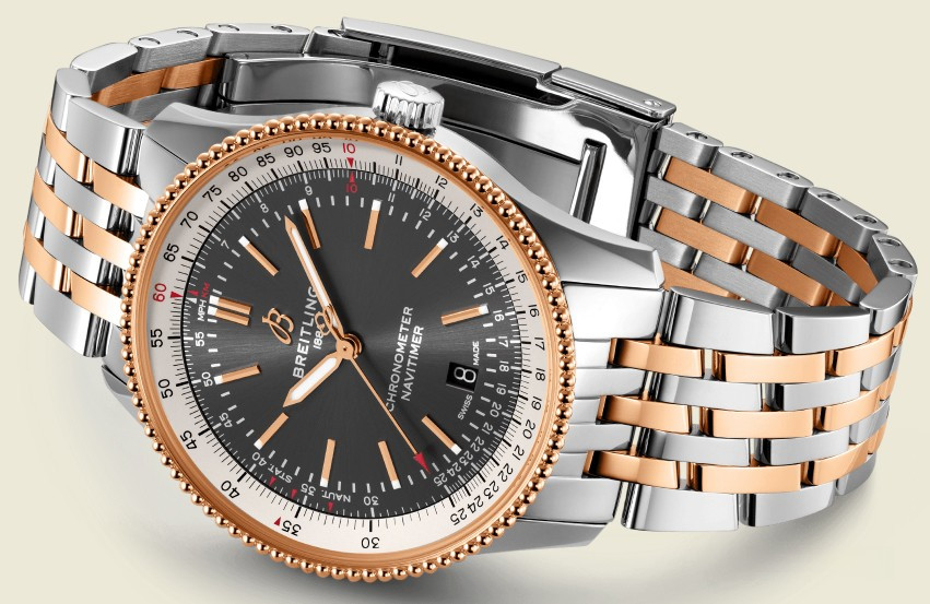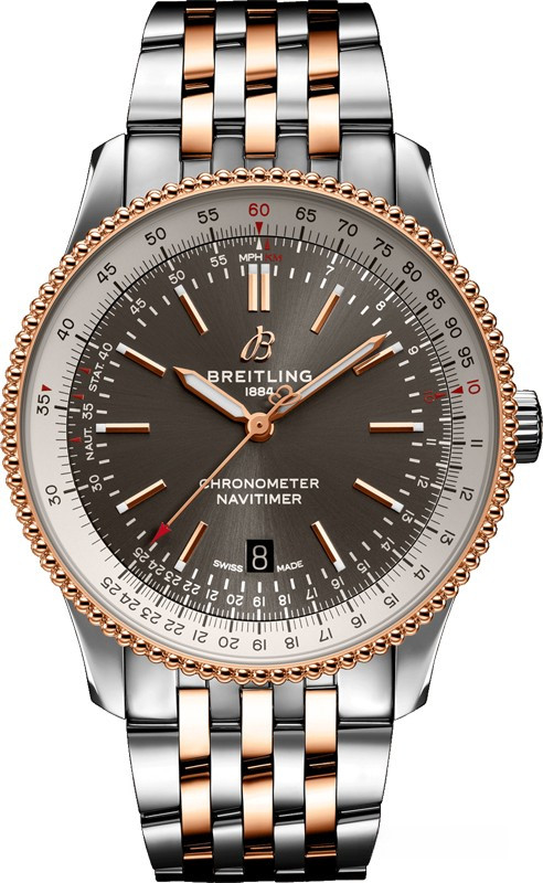 Часы Breitling Navitimer 1 Automatic 41 представлены в корпусе из нержавеющей стали и розового золота 18к размером 41 х 10 мм с вращающимся безелем и водонепроницаемостью 30 метров. Внутри корпуса установлен автоматический механизм, Калибр Breitling 17, обладающий запасом хода 38 часов. На сером циферблате отображаются часы, минуты, секунды, дата, тахиметр. Часы поставляются на браслете из нержавеющей стали и розового золота 18к.