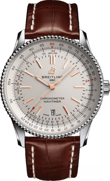 Часы Breitling Navitimer 1 Automatic 41 представлены в корпусе из нержавеющей стали размером 41 х 10 мм с вращающимся безелем и водонепроницаемостью 30 метров. Внутри корпуса установлен автоматический механизм, Калибр Breitling 17, обладающий запасом хода 38 часов. На серебристом циферблате отображаются часы, минуты, секунды, дата, тахиметр. Часы поставляются на ремешке из кожи аллигатора с вставкой из нержавеющей стали.