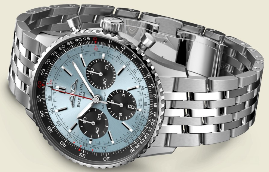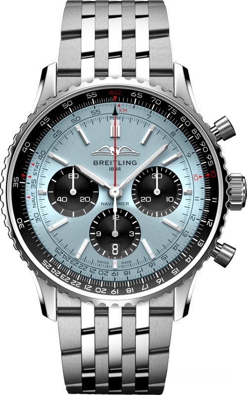 Часы Breitling Navitimer 1 B01 Chronograph 43 представлены в корпусе размером 43 х 13.6 мм из нержавеющей стали с водонепроницаемостью до 30 метров. Внутри корпуса установлен автоматический механизм, обладающий запасом хода 70 часов. На голубом циферблате отображаются часы, минуты, секунды, дата, тахиметр, накопители хронографа. Часы поставляются на браслете из нержавеющей стали.
