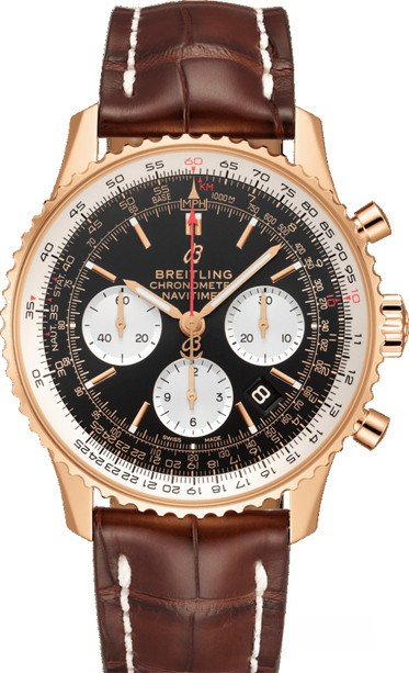 Часы Breitling Navitimer 1 B01 Chronograph 43 представлены в корпусе размером 43 х 14.22 мм из розового золота 18к с водонепроницаемостью до 30 метров. Внутри корпуса установлен автоматический механизм, обладающий запасом хода 70 часов. На черном с белым циферблате отображаются часы, минуты, секунды, дата, тахиметр, накопители хронографа. Часы поставляются на ремешке из кожи аллигатора с вставкой из розового золота 18к.