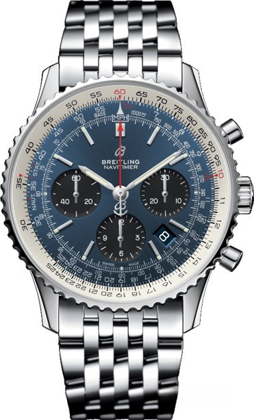 Часы Breitling Navitimer 1 B01 Chronograph 43 представлены в корпусе размером 43 х 14.22 мм из нержавеющей стали с водонепроницаемостью до 30 метров. Внутри корпуса установлен автоматический механизм, обладающий запасом хода 70 часов. На синем с черным циферблате отображаются часы, минуты, секунды, дата, тахиметр, накопители хронографа. Часы поставляются на браслете из нержавеющей стали.