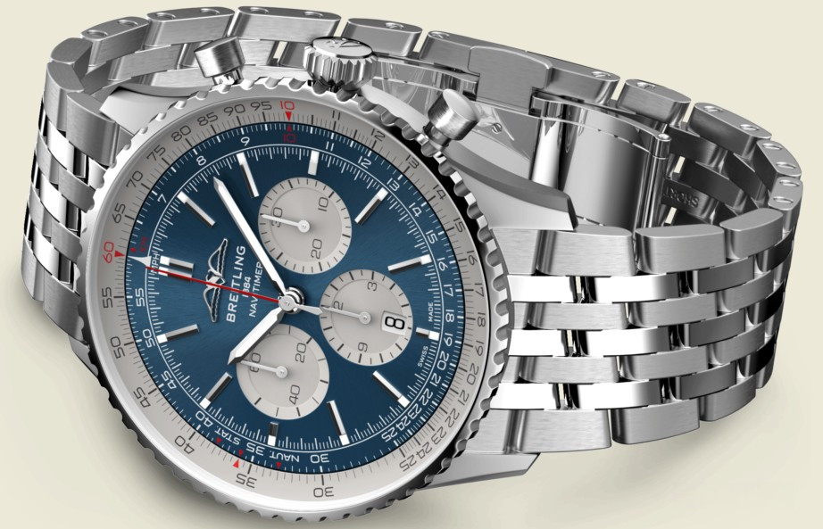 Часы Breitling Navitimer 1 B01 Chronograph 46 представлены в корпусе размером 46 х 13.9 мм из нержавеющей стали с водонепроницаемостью до 30 метров. Внутри корпуса установлен автоматический механизм, обладающий запасом хода 70 часов. На синем циферблате отображаются часы, минуты, секунды, дата, тахиметр, накопители хронографа. Часы поставляются на стальном браслете.
