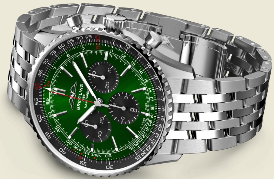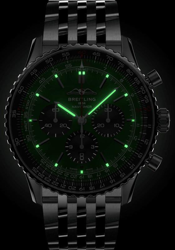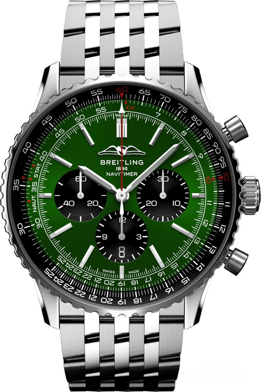 Часы Breitling Navitimer 1 B01 Chronograph 46 представлены в корпусе размером 46 х 13.9 мм из нержавеющей стали с водонепроницаемостью до 30 метров. Внутри корпуса установлен автоматический механизм, обладающий запасом хода 70 часов. На зеленом циферблате отображаются часы, минуты, секунды, дата, тахиметр, накопители хронографа. Часы поставляются на браслете из нержавеющей стали.