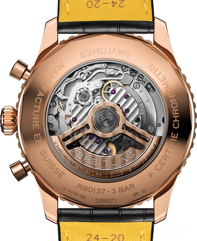 Часы Breitling Navitimer 1 B01 Chronograph 46 представлены в корпусе размером 46 х 13.9 мм из розового золота 18к с водонепроницаемостью до 30 метров. Внутри корпуса установлен автоматический механизм, обладающий запасом хода 70 часов. На серебристом циферблате отображаются часы, минуты, секунды, дата, тахиметр, накопители хронографа. Часы поставляются на ремешке из кожи аллигатора с золотой застежкой.