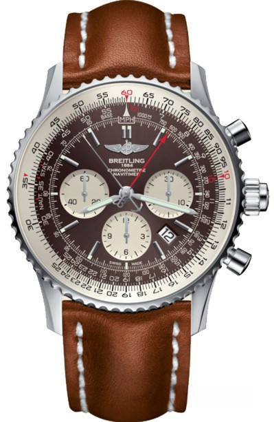 Navitimer Rattrapante от швейцарской часовой компании Breitling выпускается в корпусе из нержавеющей стали. Новинка имеет круглый корпус, диаметром 45 мм, водонепроницаемый до 30 метров. Двунаправленный рифленый вращающийся безель, позволяющий использовать круглую логарифмическую линейку. На торце рифленой заводной головки, расположенной на 3 часах, имеется сплит-пушер, на котором выгравирован логотип бренда Breitling. Пушеры хронографа размещены на 2 и 4 часах. Сапфировое стекло установлено на передней стороне часового корпуса (выпуклое, с двусторонним антибликовым покрытием) и на его задней крышке. Циферблат коричневого цвета со счетчиками белого цвета, с продолговатыми накладными часовыми индексами и точечными маркерами, которые, как и часовая и минутная стрелки, покрыты белым люминесцентным составом. Модель оснащена мануфактурным швейцарским автоматическим механизмом Bretiling B03, с модулем сплит-хронографа (состоящего из 28 деталей и извлекаемого из калибра одним блоком, что существенно облегчает его техническое обслуживание и ремонт), балансовой частотой 28800 полуколебаний в час (4 гц), 70-часовым запасом хода, официально сертифицированным COSC (Contrôle Officiel Suisse des Chronomètres) в качестве хронометра, с функциями индикации часов, минут (посредством соответствующих центральных стрелок), секунд (на соответствующем малом боковом циферблате, расположенном на 9 часах), даты (посредством соответствующего цифрового указателя в прямоугольной апертуре, расположенной между 4 и 5 часами), а также с хронографом (центральная секундная стрелка красного цвета с объемным изображением логотипа бренда Breitling на ее противовесе, центральная секундная сплит-стрелка серебристого цвета с объемным изображением якоря на ее противовесе, круглый аналоговый 30-минутный счетчик, расположенный на 3 часах и круглый аналоговый 12-часовый счетчик, расположенный на 6 часах). Поставляется на кожаном ремешке с вставкой из нержавеющей стали.