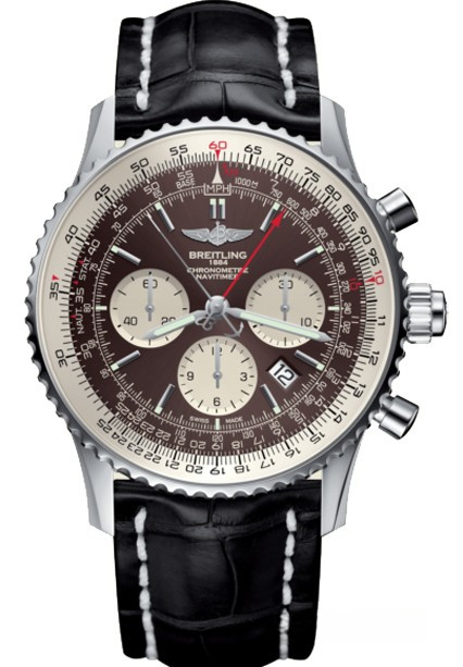 Navitimer Rattrapante от швейцарской часовой компании Breitling выпускается в корпусе из нержавеющей стали. Новинка имеет круглый корпус, диаметром 45 мм, водонепроницаемый до 30 метров. Двунаправленный рифленый вращающийся безель, позволяющий использовать круглую логарифмическую линейку. На торце рифленой заводной головки, расположенной на 3 часах, имеется сплит-пушер, на котором выгравирован логотип бренда Breitling. Пушеры хронографа размещены на 2 и 4 часах. Сапфировое стекло установлено на передней стороне часового корпуса (выпуклое, с двусторонним антибликовым покрытием) и на его задней крышке. Циферблат коричневого цвета со счетчиками белого цвета, с продолговатыми накладными часовыми индексами и точечными маркерами, которые, как и часовая и минутная стрелки, покрыты белым люминесцентным составом. Модель оснащена мануфактурным швейцарским автоматическим механизмом Bretiling B03, с модулем сплит-хронографа (состоящего из 28 деталей и извлекаемого из калибра одним блоком, что существенно облегчает его техническое обслуживание и ремонт), балансовой частотой 28800 полуколебаний в час (4 гц), 70-часовым запасом хода, официально сертифицированным COSC (Contrôle Officiel Suisse des Chronomètres) в качестве хронометра, с функциями индикации часов, минут (посредством соответствующих центральных стрелок), секунд (на соответствующем малом боковом циферблате, расположенном на 9 часах), даты (посредством соответствующего цифрового указателя в прямоугольной апертуре, расположенной между 4 и 5 часами), а также с хронографом (центральная секундная стрелка красного цвета с объемным изображением логотипа бренда Breitling на ее противовесе, центральная секундная сплит-стрелка серебристого цвета с объемным изображением якоря на ее противовесе, круглый аналоговый 30-минутный счетчик, расположенный на 3 часах и круглый аналоговый 12-часовый счетчик, расположенный на 6 часах). Поставляется на ремешке из кожи аллигатора с вставкой из нержавеющей стали.