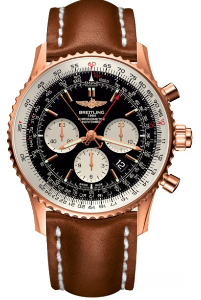 Navitimer Rattrapante от швейцарской часовой компании Breitling выпускается в корпусе из розового золота 18к. Новинка имеет круглый корпус, диаметром 45 мм, водонепроницаемый до 30 метров. Двунаправленный рифленый вращающийся безель, позволяющий использовать круглую логарифмическую линейку. На торце рифленой заводной головки, расположенной на 3 часах, имеется сплит-пушер, на котором выгравирован логотип бренда Breitling. Пушеры хронографа размещены на 2 и 4 часах. Сапфировое стекло установлено на передней стороне часового корпуса (выпуклое, с двусторонним антибликовым покрытием) и на его задней крышке. Циферблат черного цвета со счетчиками белого цвета, с продолговатыми накладными часовыми индексами и точечными маркерами, которые, как и часовая и минутная стрелки, покрыты белым люминесцентным составом. Модель оснащена мануфактурным швейцарским автоматическим механизмом Bretiling B03, с модулем сплит-хронографа (состоящего из 28 деталей и извлекаемого из калибра одним блоком, что существенно облегчает его техническое обслуживание и ремонт), балансовой частотой 28800 полуколебаний в час (4 гц), 70-часовым запасом хода, официально сертифицированным COSC (Contrôle Officiel Suisse des Chronomètres) в качестве хронометра, с функциями индикации часов, минут (посредством соответствующих центральных стрелок), секунд (на соответствующем малом боковом циферблате, расположенном на 9 часах), даты (посредством соответствующего цифрового указателя в прямоугольной апертуре, расположенной между 4 и 5 часами), а также с хронографом (центральная секундная стрелка красного цвета с объемным изображением логотипа бренда Breitling на ее противовесе, центральная секундная сплит-стрелка серебристого цвета с объемным изображением якоря на ее противовесе, круглый аналоговый 30-минутный счетчик, расположенный на 3 часах и круглый аналоговый 12-часовый счетчик, расположенный на 6 часах). Поставляется на кожаном ремешке с вставкой из розового золота 18к.