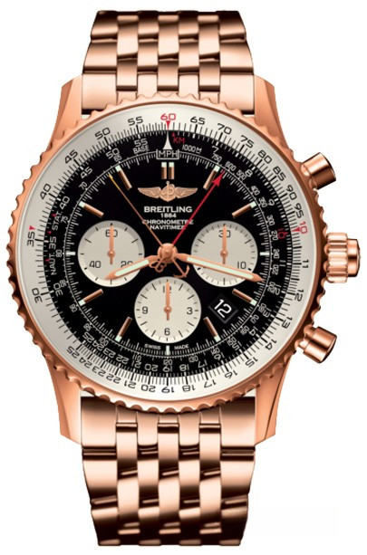 Navitimer Rattrapante от швейцарской часовой компании Breitling выпускается в корпусе из розового золота 18к. Новинка имеет круглый корпус, диаметром 45 мм, водонепроницаемый до 30 метров. Двунаправленный рифленый вращающийся безель, позволяющий использовать круглую логарифмическую линейку. На торце рифленой заводной головки, расположенной на 3 часах, имеется сплит-пушер, на котором выгравирован логотип бренда Breitling. Пушеры хронографа размещены на 2 и 4 часах. Сапфировое стекло установлено на передней стороне часового корпуса (выпуклое, с двусторонним антибликовым покрытием) и на его задней крышке. Циферблат черного цвета со счетчиками белого цвета, с продолговатыми накладными часовыми индексами и точечными маркерами, которые, как и часовая и минутная стрелки, покрыты белым люминесцентным составом. Модель оснащена мануфактурным швейцарским автоматическим механизмом Bretiling B03, с модулем сплит-хронографа (состоящего из 28 деталей и извлекаемого из калибра одним блоком, что существенно облегчает его техническое обслуживание и ремонт), балансовой частотой 28800 полуколебаний в час (4 гц), 70-часовым запасом хода, официально сертифицированным COSC (Contrôle Officiel Suisse des Chronomètres) в качестве хронометра, с функциями индикации часов, минут (посредством соответствующих центральных стрелок), секунд (на соответствующем малом боковом циферблате, расположенном на 9 часах), даты (посредством соответствующего цифрового указателя в прямоугольной апертуре, расположенной между 4 и 5 часами), а также с хронографом (центральная секундная стрелка красного цвета с объемным изображением логотипа бренда Breitling на ее противовесе, центральная секундная сплит-стрелка серебристого цвета с объемным изображением якоря на ее противовесе, круглый аналоговый 30-минутный счетчик, расположенный на 3 часах и круглый аналоговый 12-часовый счетчик, расположенный на 6 часах). Поставляется на браслете из розового золота 18к.