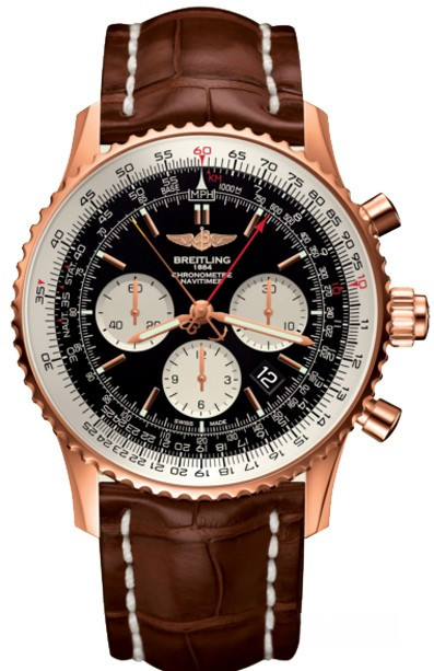 Navitimer Rattrapante от швейцарской часовой компании Breitling выпускается в корпусе из розового золота 18к. Новинка имеет круглый корпус, диаметром 45 мм, водонепроницаемый до 30 метров. Двунаправленный рифленый вращающийся безель, позволяющий использовать круглую логарифмическую линейку. На торце рифленой заводной головки, расположенной на 3 часах, имеется сплит-пушер, на котором выгравирован логотип бренда Breitling. Пушеры хронографа размещены на 2 и 4 часах. Сапфировое стекло установлено на передней стороне часового корпуса (выпуклое, с двусторонним антибликовым покрытием) и на его задней крышке. Циферблат черного цвета со счетчиками белого цвета, с продолговатыми накладными часовыми индексами и точечными маркерами, которые, как и часовая и минутная стрелки, покрыты белым люминесцентным составом. Модель оснащена мануфактурным швейцарским автоматическим механизмом Bretiling B03, с модулем сплит-хронографа (состоящего из 28 деталей и извлекаемого из калибра одним блоком, что существенно облегчает его техническое обслуживание и ремонт), балансовой частотой 28800 полуколебаний в час (4 гц), 70-часовым запасом хода, официально сертифицированным COSC (Contrôle Officiel Suisse des Chronomètres) в качестве хронометра, с функциями индикации часов, минут (посредством соответствующих центральных стрелок), секунд (на соответствующем малом боковом циферблате, расположенном на 9 часах), даты (посредством соответствующего цифрового указателя в прямоугольной апертуре, расположенной между 4 и 5 часами), а также с хронографом (центральная секундная стрелка красного цвета с объемным изображением логотипа бренда Breitling на ее противовесе, центральная секундная сплит-стрелка серебристого цвета с объемным изображением якоря на ее противовесе, круглый аналоговый 30-минутный счетчик, расположенный на 3 часах и круглый аналоговый 12-часовый счетчик, расположенный на 6 часах). Поставляется на ремешке из кожи аллигатора с вставкой из розового золота 18к.