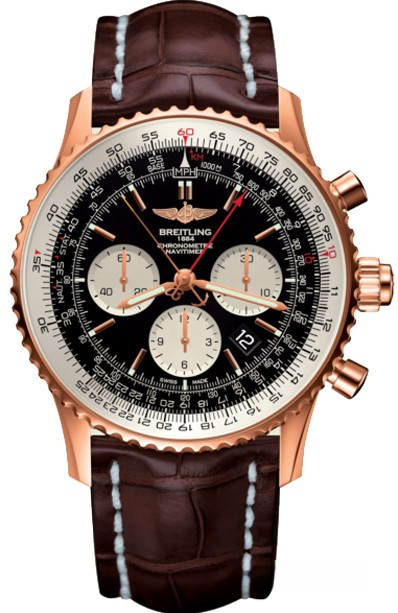 Navitimer Rattrapante от швейцарской часовой компании Breitling выпускается в корпусе из розового золота 18к. Новинка имеет круглый корпус, диаметром 45 мм, водонепроницаемый до 30 метров. Двунаправленный рифленый вращающийся безель, позволяющий использовать круглую логарифмическую линейку. На торце рифленой заводной головки, расположенной на 3 часах, имеется сплит-пушер, на котором выгравирован логотип бренда Breitling. Пушеры хронографа размещены на 2 и 4 часах. Сапфировое стекло установлено на передней стороне часового корпуса (выпуклое, с двусторонним антибликовым покрытием) и на его задней крышке. Циферблат черного цвета со счетчиками белого цвета, с продолговатыми накладными часовыми индексами и точечными маркерами, которые, как и часовая и минутная стрелки, покрыты белым люминесцентным составом. Модель оснащена мануфактурным швейцарским автоматическим механизмом Bretiling B03, с модулем сплит-хронографа (состоящего из 28 деталей и извлекаемого из калибра одним блоком, что существенно облегчает его техническое обслуживание и ремонт), балансовой частотой 28800 полуколебаний в час (4 гц), 70-часовым запасом хода, официально сертифицированным COSC (Contrôle Officiel Suisse des Chronomètres) в качестве хронометра, с функциями индикации часов, минут (посредством соответствующих центральных стрелок), секунд (на соответствующем малом боковом циферблате, расположенном на 9 часах), даты (посредством соответствующего цифрового указателя в прямоугольной апертуре, расположенной между 4 и 5 часами), а также с хронографом (центральная секундная стрелка красного цвета с объемным изображением логотипа бренда Breitling на ее противовесе, центральная секундная сплит-стрелка серебристого цвета с объемным изображением якоря на ее противовесе, круглый аналоговый 30-минутный счетчик, расположенный на 3 часах и круглый аналоговый 12-часовый счетчик, расположенный на 6 часах). Поставляется на ремешке из кожи аллигатора с вставкой из розового золота 18к.