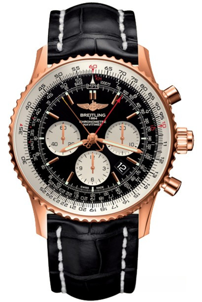 Navitimer Rattrapante от швейцарской часовой компании Breitling выпускается в корпусе из розового золота 18ки. Новинка имеет круглый корпус, диаметром 45 мм, водонепроницаемый до 30 метров. Двунаправленный рифленый вращающийся безель, позволяющий использовать круглую логарифмическую линейку. На торце рифленой заводной головки, расположенной на 3 часах, имеется сплит-пушер, на котором выгравирован логотип бренда Breitling. Пушеры хронографа размещены на 2 и 4 часах. Сапфировое стекло установлено на передней стороне часового корпуса (выпуклое, с двусторонним антибликовым покрытием) и на его задней крышке. Циферблат черного цвета со счетчиками белого цвета, с продолговатыми накладными часовыми индексами и точечными маркерами, которые, как и часовая и минутная стрелки, покрыты белым люминесцентным составом. Модель оснащена мануфактурным швейцарским автоматическим механизмом Bretiling B03, с модулем сплит-хронографа (состоящего из 28 деталей и извлекаемого из калибра одним блоком, что существенно облегчает его техническое обслуживание и ремонт), балансовой частотой 28800 полуколебаний в час (4 гц), 70-часовым запасом хода, официально сертифицированным COSC (Contrôle Officiel Suisse des Chronomètres) в качестве хронометра, с функциями индикации часов, минут (посредством соответствующих центральных стрелок), секунд (на соответствующем малом боковом циферблате, расположенном на 9 часах), даты (посредством соответствующего цифрового указателя в прямоугольной апертуре, расположенной между 4 и 5 часами), а также с хронографом (центральная секундная стрелка красного цвета с объемным изображением логотипа бренда Breitling на ее противовесе, центральная секундная сплит-стрелка серебристого цвета с объемным изображением якоря на ее противовесе, круглый аналоговый 30-минутный счетчик, расположенный на 3 часах и круглый аналоговый 12-часовый счетчик, расположенный на 6 часах). Поставляется на ремешке из крокодиловой кожи.