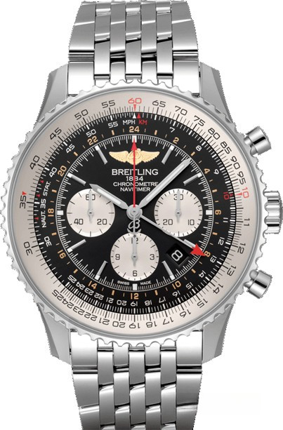 Часы Breitling Navitimer 1 B04 Chronograph GMT 48 представлены в корпусе из нержавеющей стали размером 48 х 15.8 мм с вращающимся безелем и водонепроницаемостью 30 метров. Внутри корпуса установлен автоматический механизм, Калибр Breitling B04, обладающий запасом хода 70 часов. На черном с серебристым циферблате отображаются часы, минуты, секунды, дата, накопители хронографа, тахиметр, время второго часового пояса. Часы поставляются на браслете из нержавеющей стали.