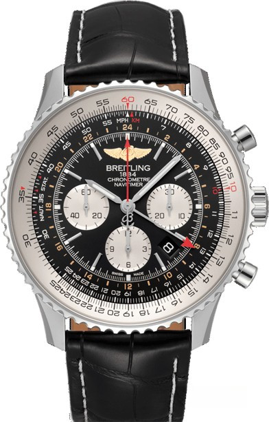Часы Breitling Navitimer 1 B04 Chronograph GMT 48 представлены в корпусе из нержавеющей стали размером 48 х 15.8 мм с вращающимся безелем и водонепроницаемостью 30 метров. Внутри корпуса установлен автоматический механизм, Калибр Breitling B04, обладающий запасом хода 70 часов. На черном с серебристым циферблате отображаются часы, минуты, секунды, дата, накопители хронографа, тахиметр, время второго часового пояса. Часы поставляются на ремешке из кожи аллигатора с вставкой из нержавеющей стали.