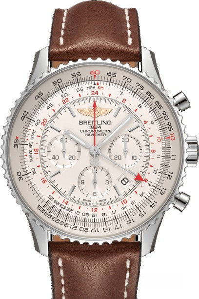 Часы Breitling Navitimer 1 B04 Chronograph GMT 48 представлены в корпусе из нержавеющей стали размером 48 х 15.8 мм с вращающимся безелем и водонепроницаемостью 30 метров. Внутри корпуса установлен автоматический механизм, Калибр Breitling B04, обладающий запасом хода 70 часов. На серебристом циферблате отображаются часы, минуты, секунды, дата, накопители хронографа, тахиметр, время второго часового пояса. Часы поставляются на кожаном ремешке с вставкой из нержавеющей стали.