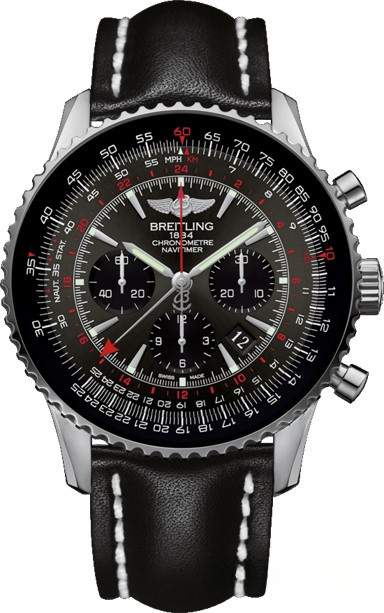 Часы Breitling Navitimer 1 B04 Chronograph GMT 48 представлены в корпусе из нержавеющей стали размером 48 х 15.8 мм с вращающимся безелем и водонепроницаемостью 30 метров. Внутри корпуса установлен автоматический механизм, Калибр Breitling B04, обладающий запасом хода 70 часов. На черном циферблате отображаются часы, минуты, секунды, дата, накопители хронографа, тахиметр, время второго часового пояса. Часы поставляются на кожаном ремешке с вставкой из нержавеющей стали.