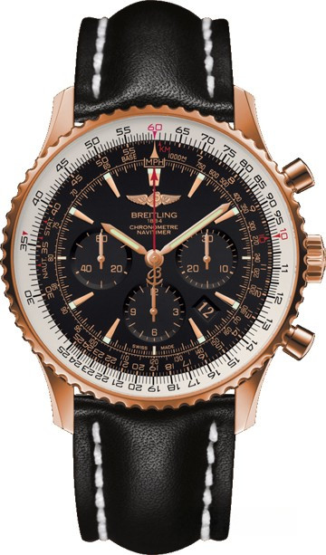 Часы Breitling Navitimer 01 46 mm представлены в корпусе из розового золота 18к размером 46 х 14.5 мм и водонепроницаемостью 30 метров. Внутри корпуса установлен автоматический механизм, Калибр Breitling 01, обладающий запасом хода 70 часов. На черном с белым циферблате отображаются часы, минуты, секунды, дата, накопители хронографа, тахиметр. Часы поставляются на кожаном ремешке с вставкой из розового золота 18к.