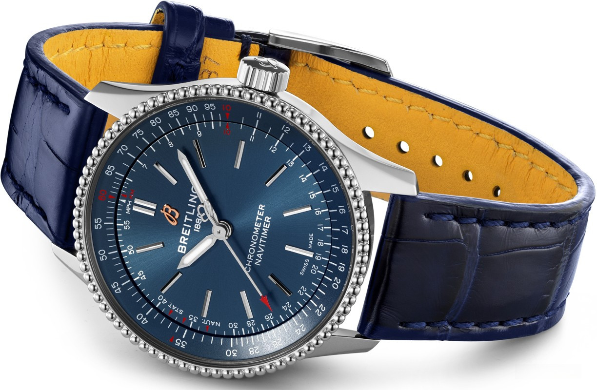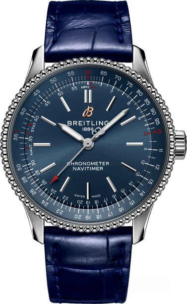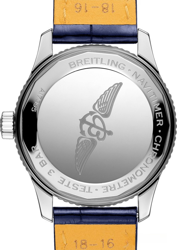 Часы Breitling Navitimer Automatic 35 mm представлены в корпусе из нержавеющей стали размером 35 х 9.92 мм и водонепроницаемостью до 30 метров. Внутри корпуса установлен автоматический механизм, Калибр Breitling 17. На синем циферблате отображаются часы, минуты, секунды. Часы комплектуются ремешком из кожи аллигатора с вставкой из нержавеющей стали.