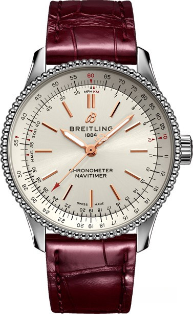 Часы Breitling Navitimer Automatic 35 mm представлены в корпусе из нержавеющей стали размером 35 х 9.92 мм и водонепроницаемостью до 30 метров. Внутри корпуса установлен автоматический механизм, Калибр Breitling 17. На серебристом циферблате отображаются часы, минуты, секунды. Часы комплектуются ремешком из кожи аллигатора с вставкой из нержавеющей стали.