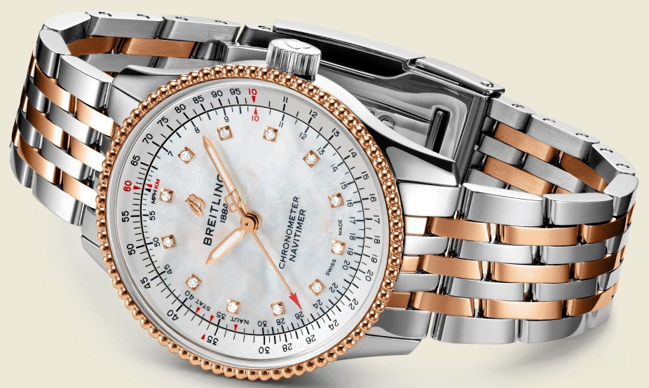 Часы Breitling Navitimer Automatic 35 mm представлены в корпусе из нержавеющей стали и розового золота 18к размером 35 х 9.92 мм и водонепроницаемостью до 30 метров. Внутри корпуса установлен автоматический механизм, Калибр Breitling 17. На белом жемчужном циферблате с 12-ю белыми бриллиантами отображаются часы, минуты, секунды. Часы комплектуются браслетом из нержавеющей стали и розового золота 18к.