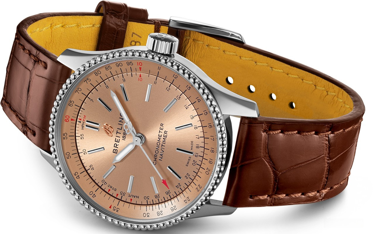 Часы Breitling Navitimer Automatic 35 mm представлены в корпусе из нержавеющей стали размером 35 х 9.92 мм и водонепроницаемостью до 30 метров. Внутри корпуса установлен автоматический механизм, Калибр Breitling 17. На золотистом циферблате отображаются часы, минуты, секунды. Часы комплектуются ремешком из кожи аллигатора с вставкой из нержавеющей стали.