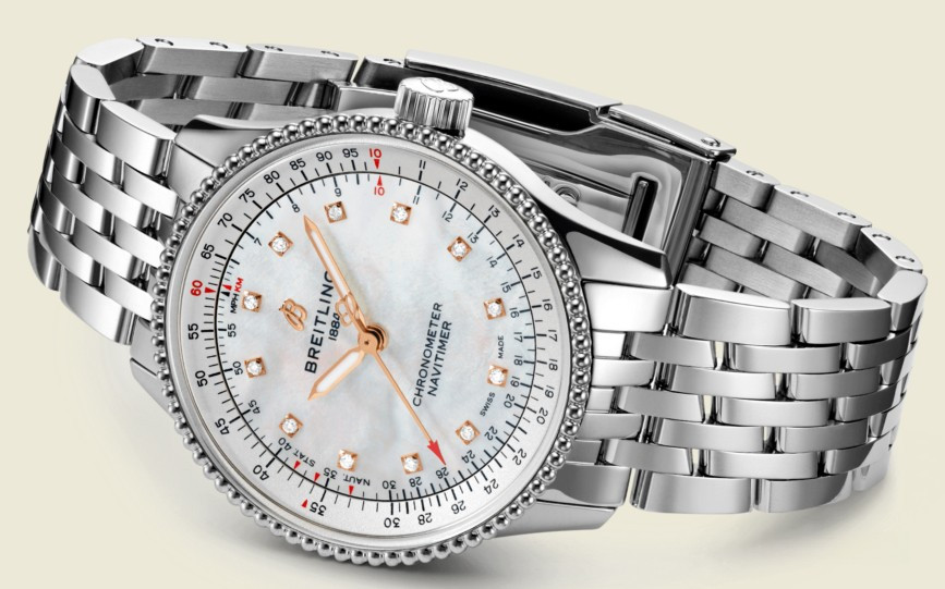 Часы Breitling Navitimer Automatic 35 mm представлены в корпусе из нержавеющей стали размером 35 х 9.92 мм и водонепроницаемостью до 30 метров. Внутри корпуса установлен автоматический механизм, Калибр Breitling 17. На белом жемчужном циферблате с 12-ю белыми бриллиантами отображаются часы, минуты, секунды. Часы комплектуются браслетом из нержавеющей стали.