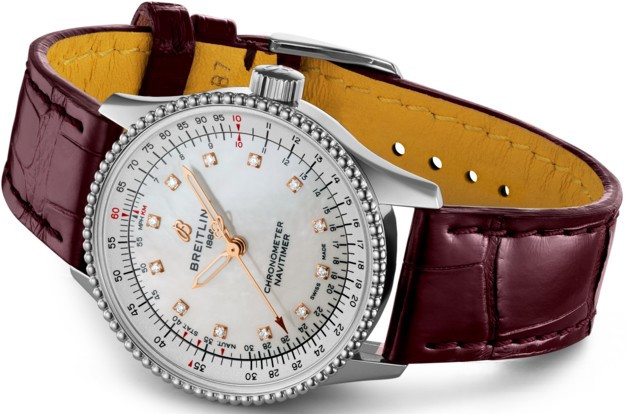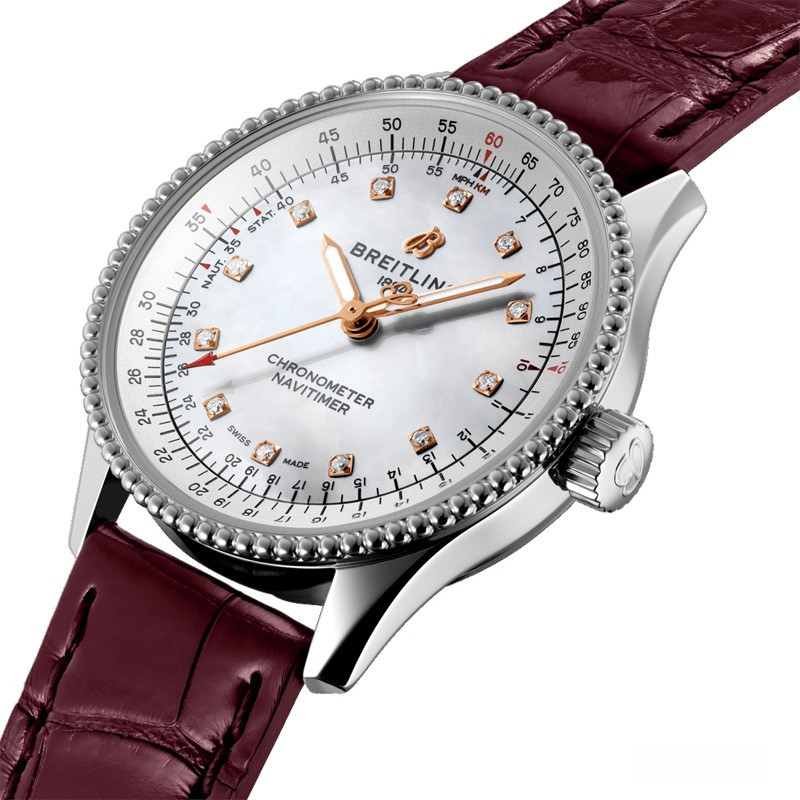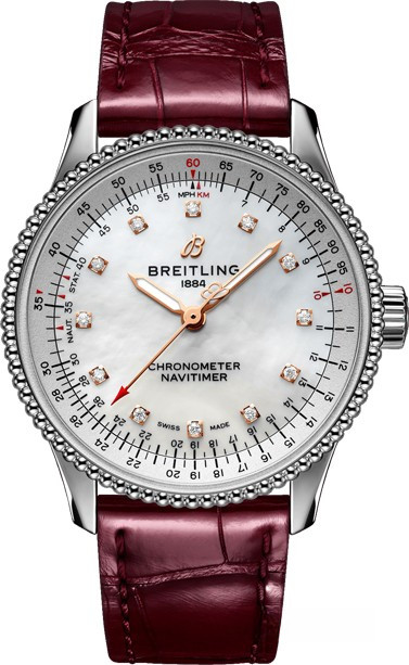 Часы Breitling Navitimer Automatic 35 mm представлены в корпусе из нержавеющей стали размером 35 х 9.92 мм и водонепроницаемостью до 30 метров. Внутри корпуса установлен автоматический механизм, Калибр Breitling 17. На белом жемчужном циферблате с 12-ю белыми бриллиантами отображаются часы, минуты, секунды. Часы комплектуются ремешком из кожи аллигатора с вставкой из нержавеющей стали.