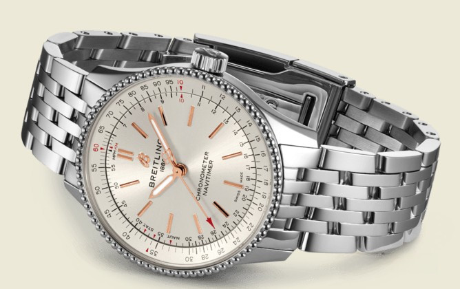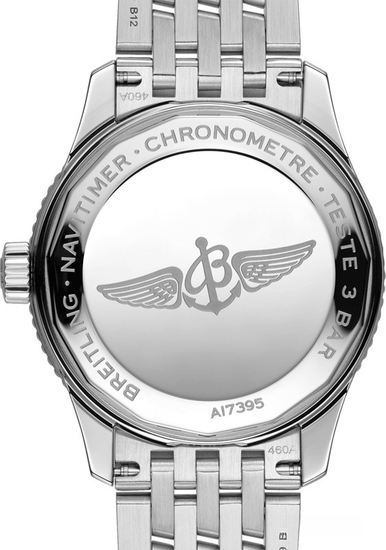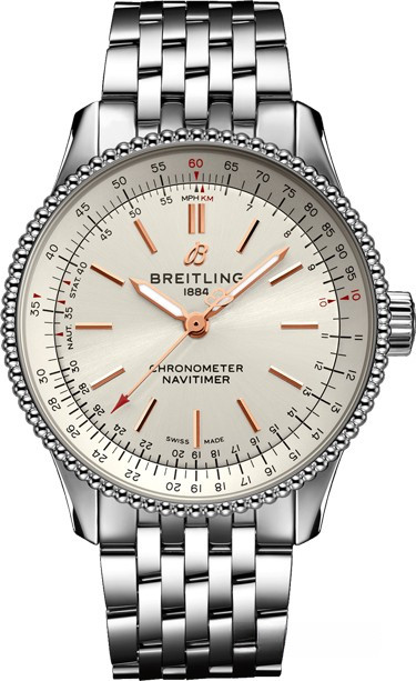 Часы Breitling Navitimer Automatic 35 mm представлены в корпусе из нержавеющей стали размером 35 х 9.92 мм и водонепроницаемостью до 30 метров. Внутри корпуса установлен автоматический механизм, Калибр Breitling 17. На серебристом циферблате отображаются часы, минуты, секунды. Часы комплектуются браслетом из нержавеющей стали.
