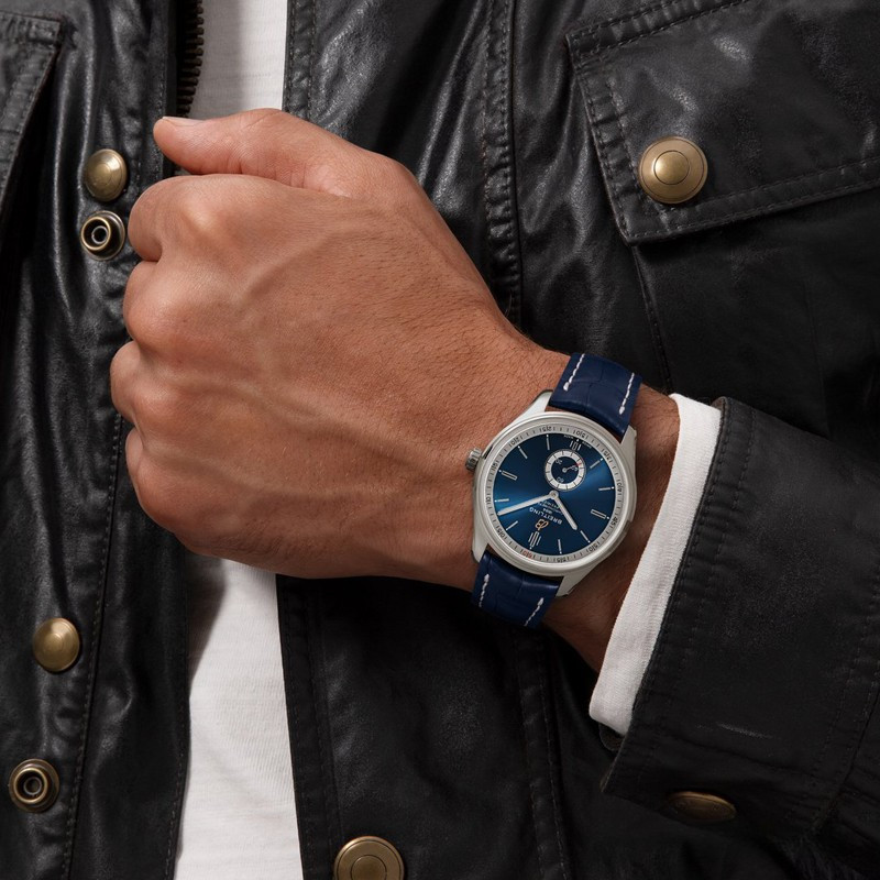 Часы Breitling Premier Automatic 40 представлены в корпусе из нержавеющей стали размером 40 х 11.4 мм. Внутри корпуса установлен автоматический механизм, Калибр Breitling 37, обладающий запасом хода 38 часов. На синем циферблате отображаются часы, минуты, секунды. Часы поставляются на ремешке из кожи аллигатора с вставкой из нержавеющей стали. Водонепроницаемость корпуса составляет 100 метров.