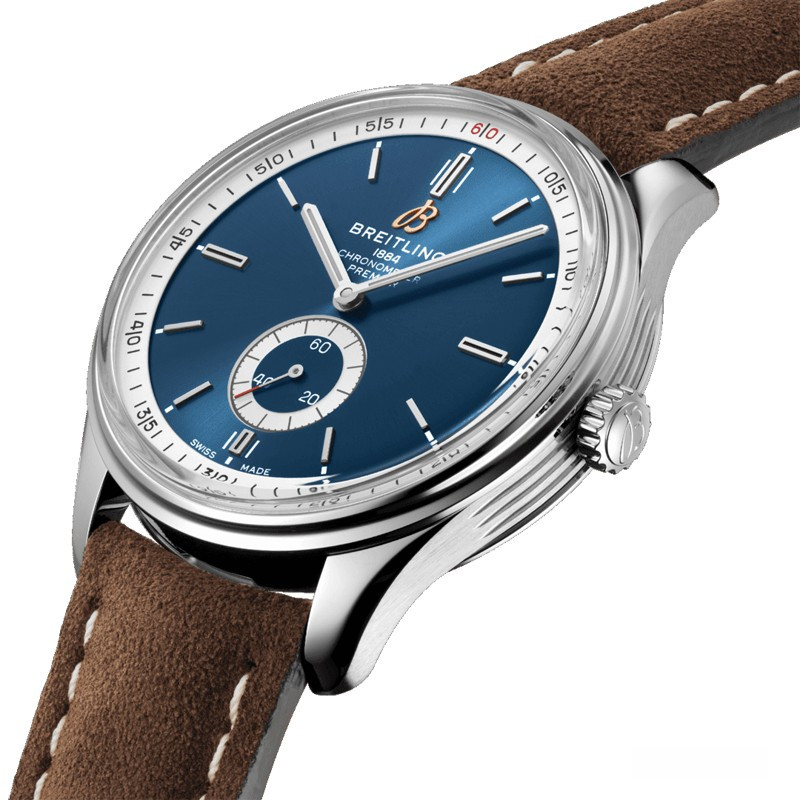 Часы Breitling Premier Automatic 40 представлены в корпусе из нержавеющей стали размером 40 х 11.4 мм. Внутри корпуса установлен автоматический механизм, Калибр Breitling 37, обладающий запасом хода 38 часов. На синем циферблате отображаются часы, минуты, секунды. Часы поставляются на кожаном ремешке с вставкой из нержавеющей стали. Водонепроницаемость корпуса составляет 100 метров.