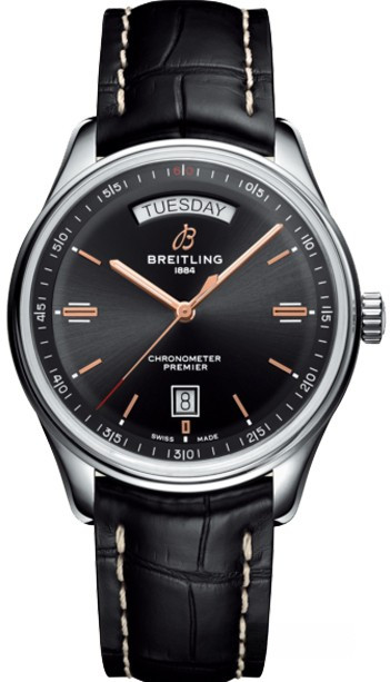 Часы Breitling Premier Automatic Day Date 40 представлены в корпусе из нержавеющей стали размером 40 х 11.4 мм. Внутри корпуса установлен автоматический механизм, Калибр Breitling 45, обладающий запасом хода 38 часов. На черном циферблате отображаются часы, минуты, секунды, дата, день недели. Часы поставляются на ремешке из кожи аллигатора с вставкой из нержавеющей стали. Водонепроницаемость корпуса составляет 100 метров.
