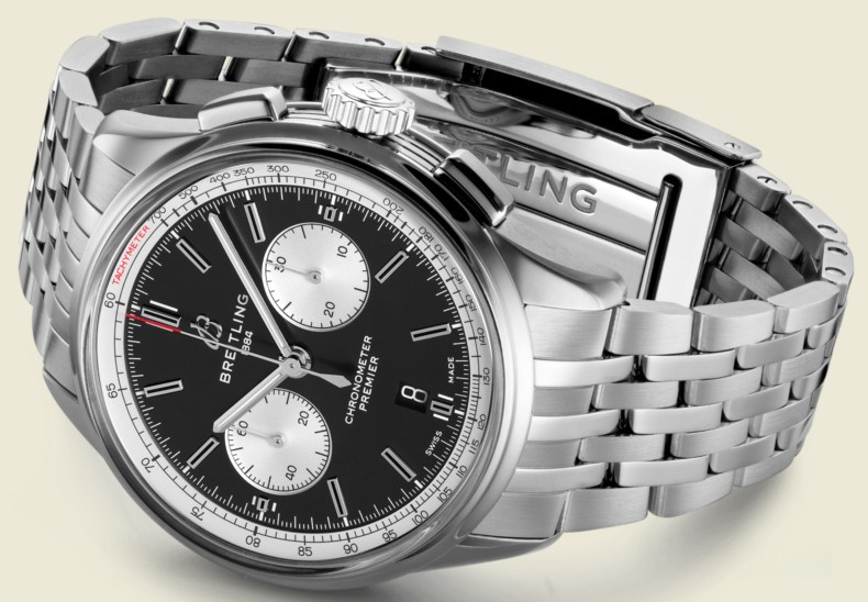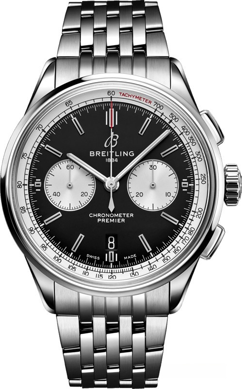 Часы Breitling Premier B01 Chronograph 42 представлены в корпусе из нержавеющей стали размером 42 х 13.65 мм. Внутри корпуса установлен автоматический механизм, Калибр Breitling 01, обладающий запасом хода 70 часов. На черном с серебристым циферблате отображаются часы, минуты, секунды, дата, тахиметр, накопители хронографа. Часы поставляются на браслете из нержавеющей стали. Водонепроницаемость корпуса составляет 100 метров.