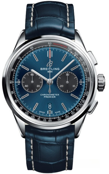 Часы Breitling Premier B01 Chronograph 42 представлены в корпусе из нержавеющей стали размером 42 х 13.65 мм. Внутри корпуса установлен автоматический механизм, Калибр Breitling 01, обладающий запасом хода 70 часов. На синем с черным циферблате отображаются часы, минуты, секунды, дата, тахиметр, накопители хронографа. Часы поставляются на ремешке из кожи аллигатора с вставкой из нержавеющей стали. Водонепроницаемость корпуса составляет 100 метров.