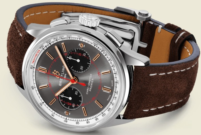 Компания Breitling отмечает свою связь с миром мотоциклов и серфинга, выпустив новую лимитированную версию своего хронографа Premier B01. Часы Premier B01 Chronograph 42 Wheels and Waves Limited Edition представлены в корпусе из нержавеющей стали ограниченной серией 500 штук. Корпус размером 42 x 13.65 мм имеет гравированную табличку с надписью Breitling Special на левой стороне. Часы отличаются антрацитовым циферблатом с золотыми часовыми метками, часовой и минутной стрелками и красной центральной секундной стрелкой. Циферблат также имеет черную тахиметрическую шкалу на белой внутренней панели с красными цифрами для тахиметра. Два контрастных черных счетчика хронографа типичны для моделей Breitling, оснащенных флагманским мануфактурным Калибром 01, механизмом с автоподзаводом, сертифицированным COSC. Видимый через прозрачную заднюю крышку, этот механизм работает с балансовой частотой 4 Гц и обладает запасом хода около 70 часов. Часы поставляются на коричневом нубуковом кожаном ремешке. Водонепроницаемость корпуса составляет 100 метров.