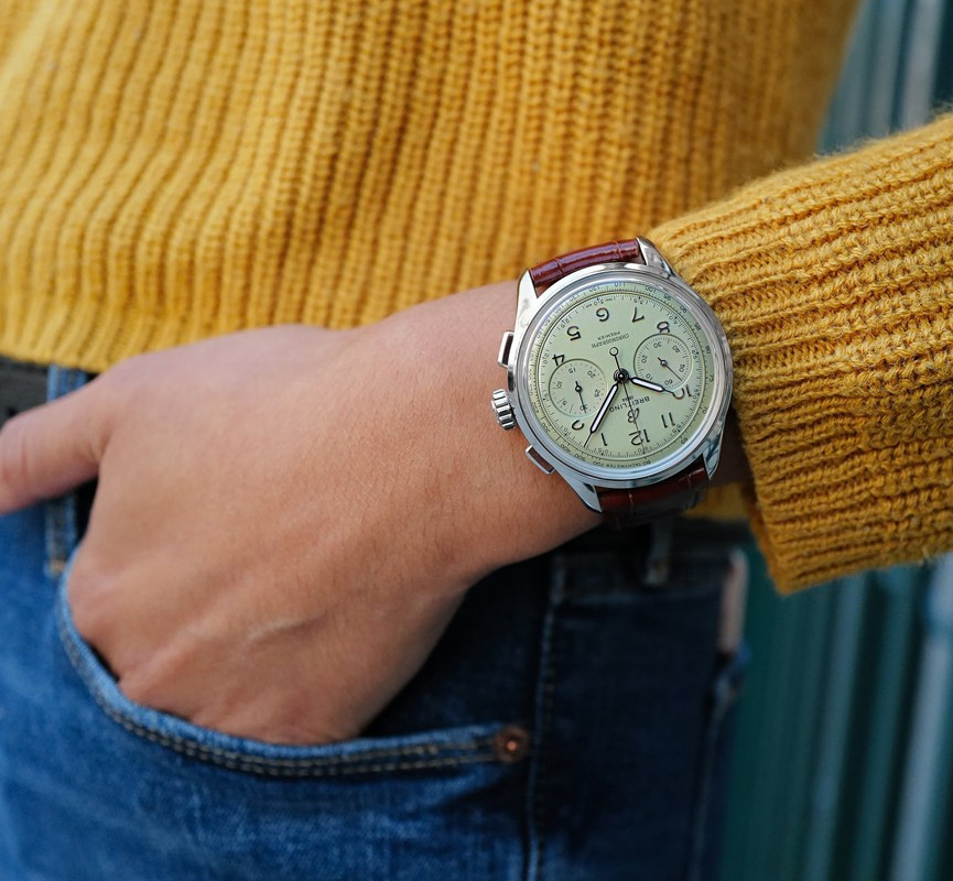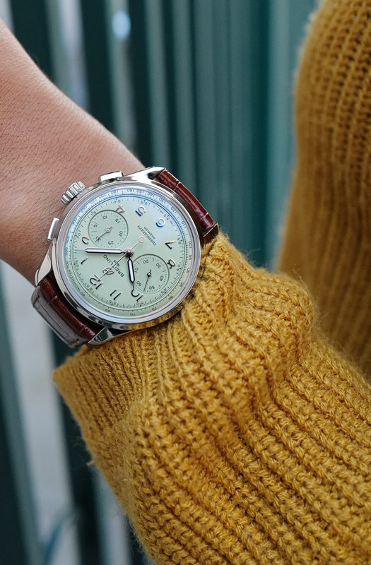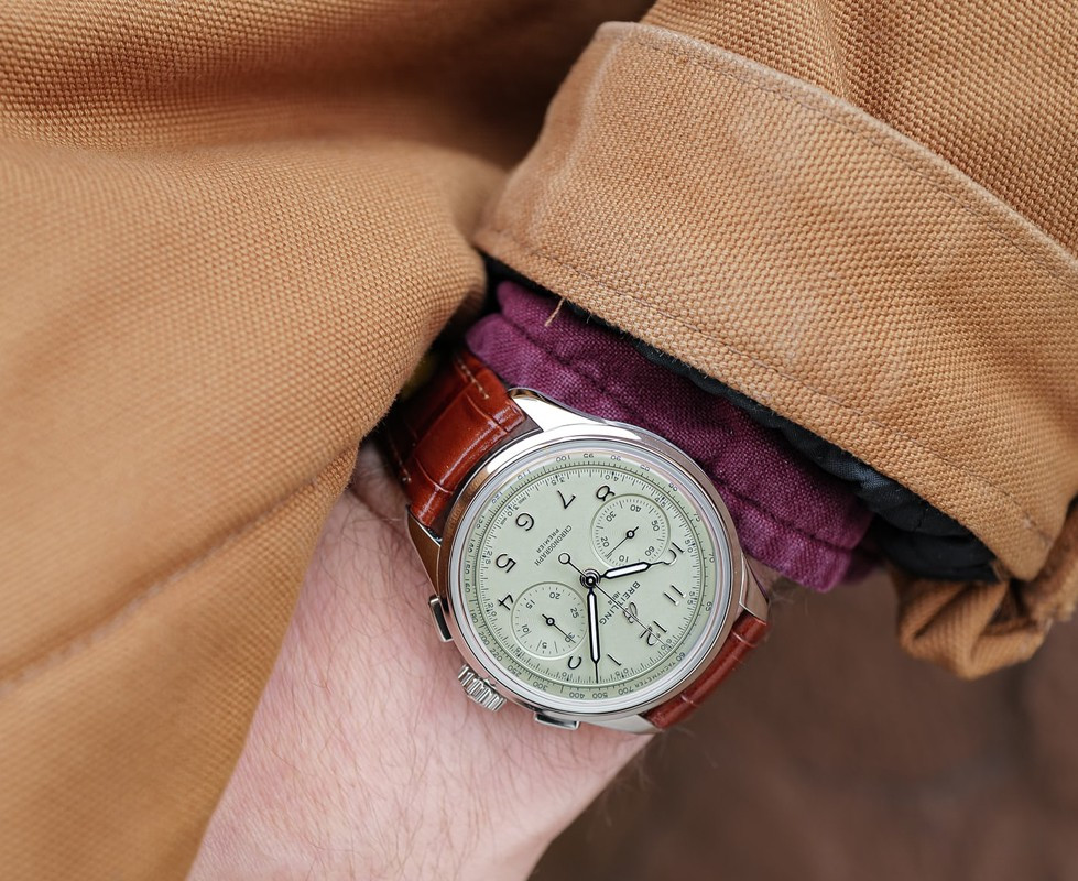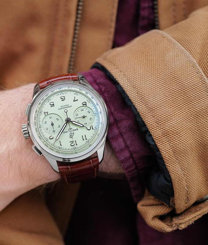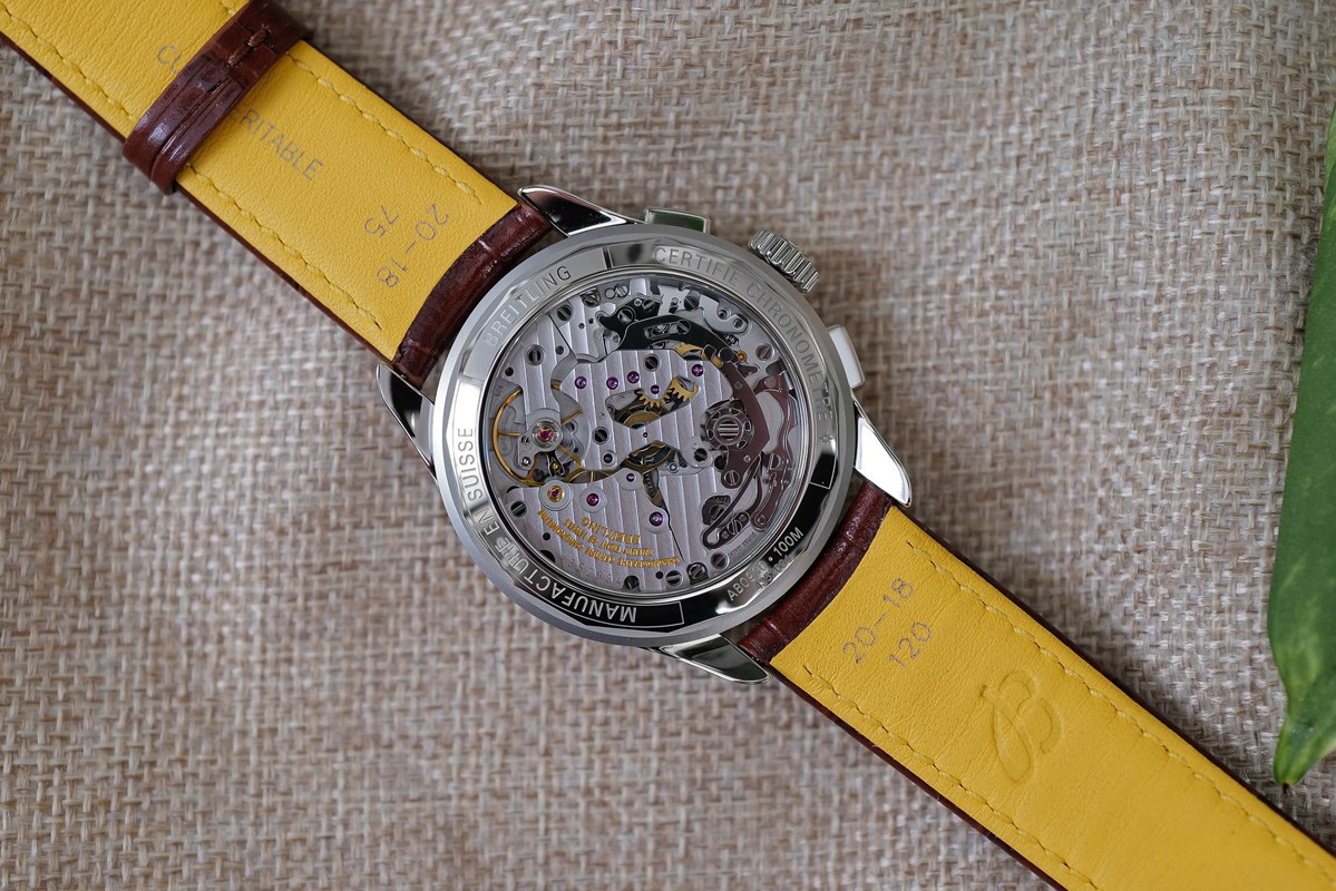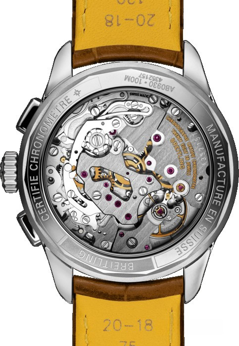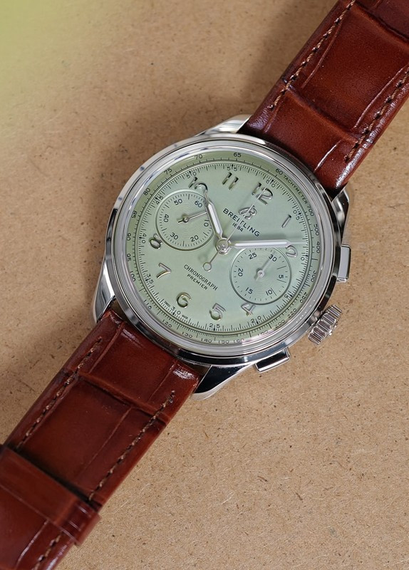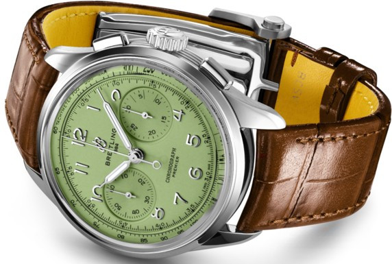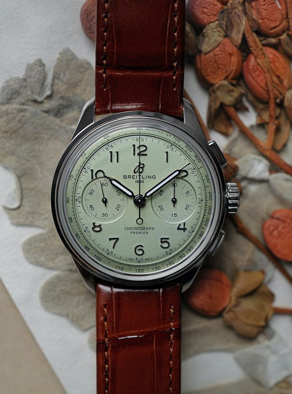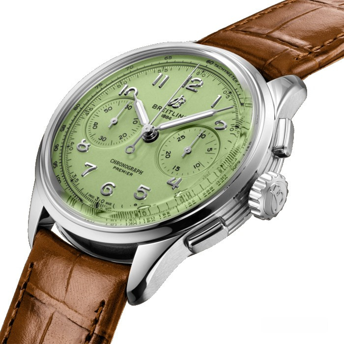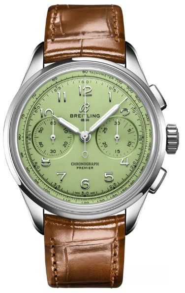 Часы Breitling Premier B09 Chronograph 40 представлены в корпусе из нержавеющей стали размером 40 х 13 мм водонепроницаемостью 100 метров. Внутри корпуса находится механизм с ручным заводом, Калибр Breitling B09, обладающий запасом хода 70 часов. На зеленом циферблате отображаются часы, минуты, секунды, тахиметр, накопители хронографа. Часы поставляются на ремешке из кожи аллигатора с вставкой из нержавеющей стали.