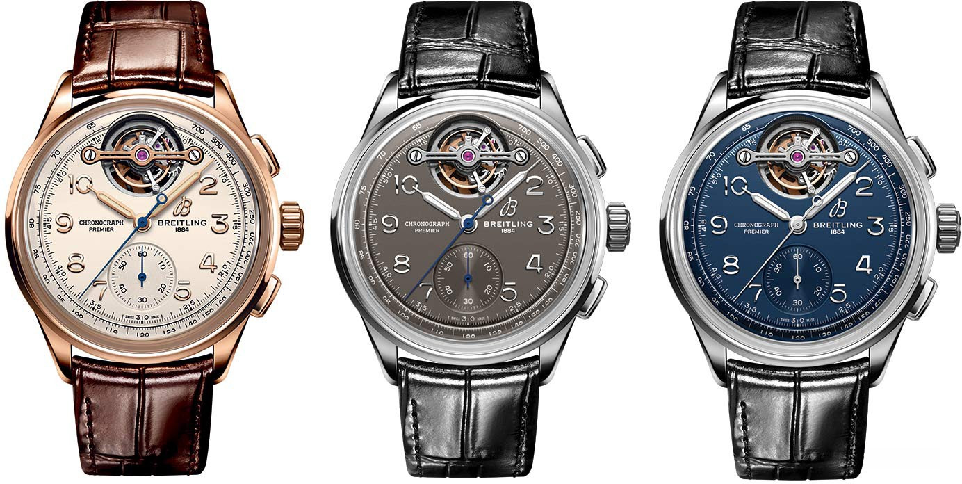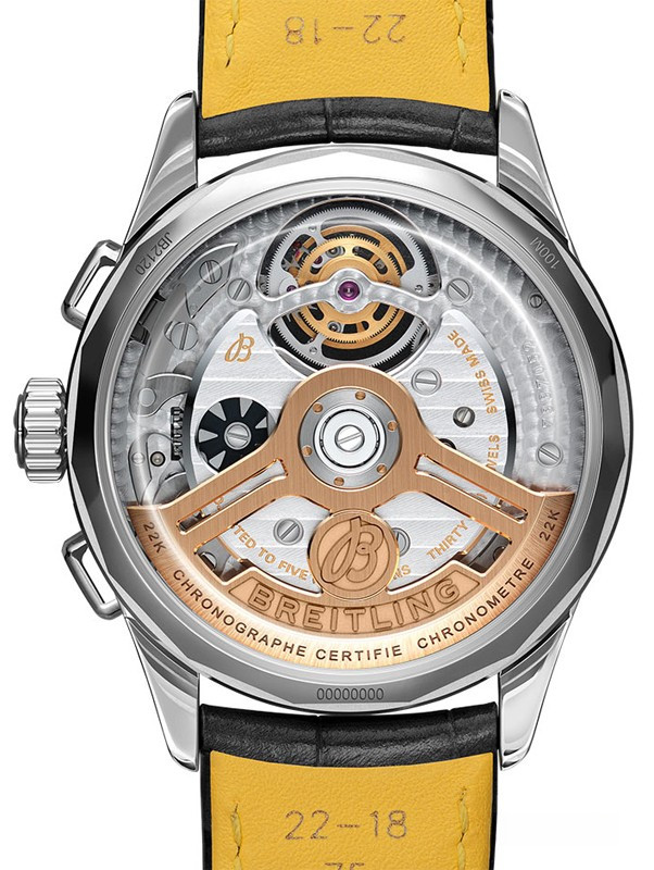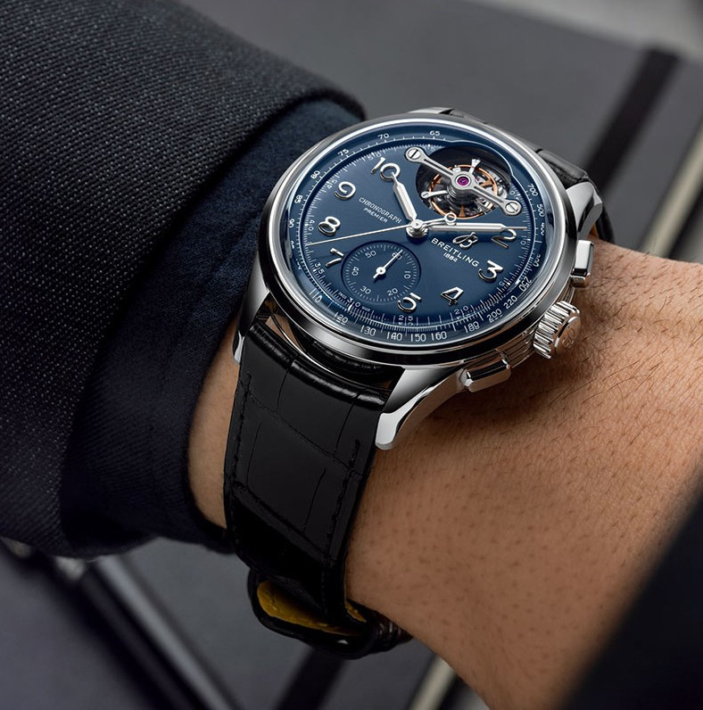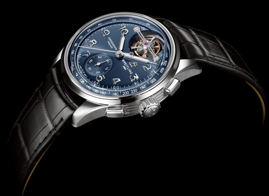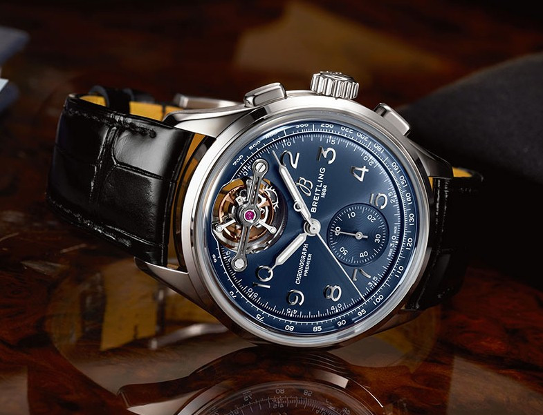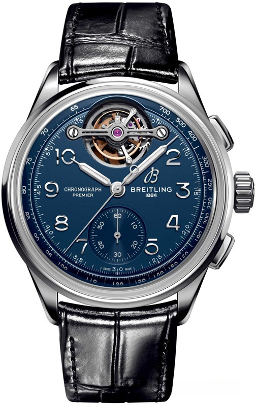 Часы Breitling Premier B21 Chronograph Tourbillon 42 представлены в корпусе из платины 950 размером 42 х 15.25 мм водонепроницаемостью 100 метров. Внутри корпуса находится автоматический механизм, Калибр B21, обладающий запасом хода 55 часов. На синем циферблате отображаются часы, минуты, секунды, тахиметр, турбийон. Часы поставляются на ремешке из кожи аллигатора с платиновой застежкой.
