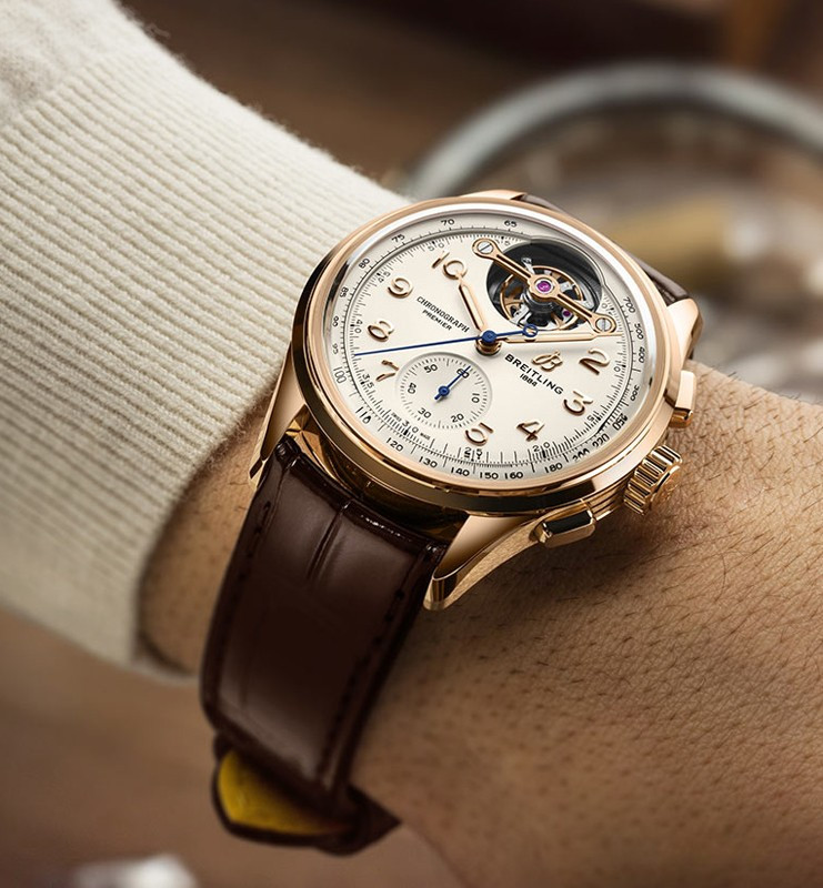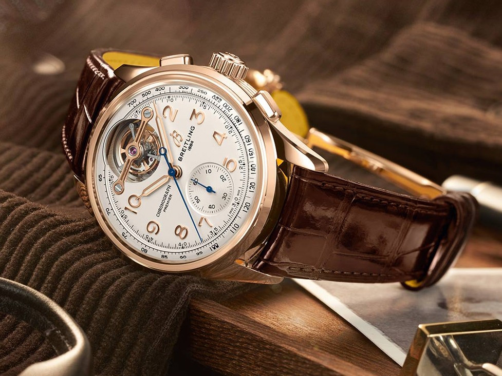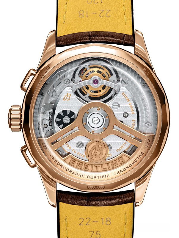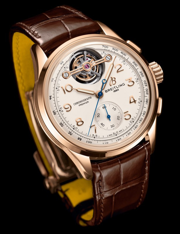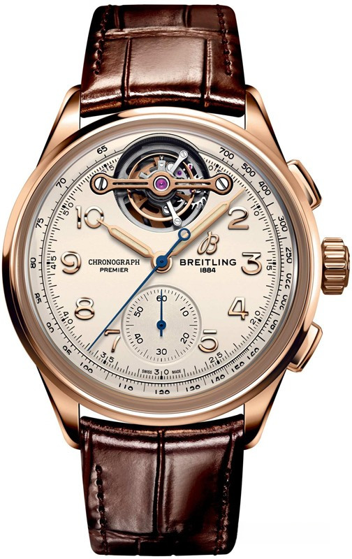 Часы Breitling Premier B21 Chronograph Tourbillon 42 представлены в корпусе из розового золота 18к размером 42 х 15.25 мм водонепроницаемостью 100 метров. Внутри корпуса находится автоматический механизм, Калибр B21, обладающий запасом хода 55 часов. На серебристом циферблате отображаются часы, минуты, секунды, тахиметр, турбийон. Часы поставляются на ремешке из кожи аллигатора с золотой застежкой.