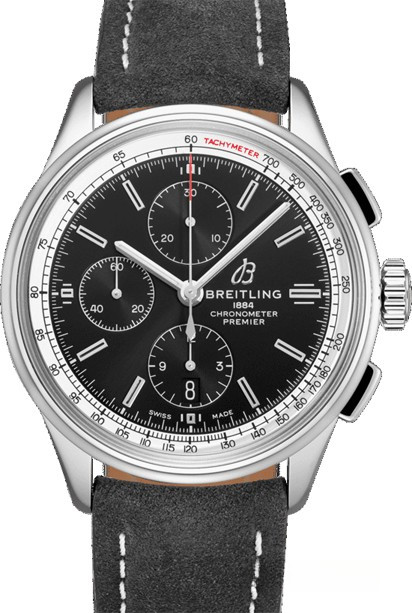 Часы Breitling Premier Chronograph 42 представлены в корпусе из нержавеющей стали размером 42 х 13.8 мм. Внутри корпуса установлен автоматический механизм, Калибр Breitling 13, обладающий запасом хода 48 часов. На черном циферблате отображаются часы, минуты, секунды, дата, тахиметр, накопители хронографа. Часы поставляются на кожаном ремешке с вставкой из нержавеющей стали. Водонепроницаемость корпуса составляет 100 метров.