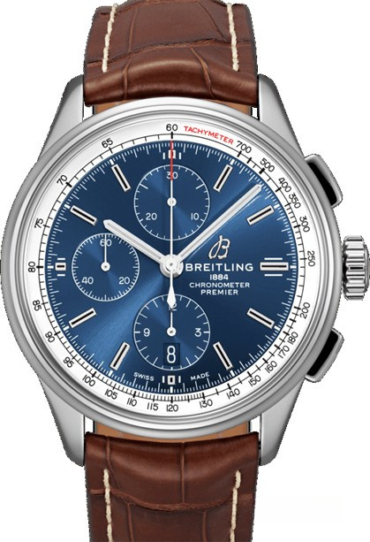 Часы Breitling Premier Chronograph 42 представлены в корпусе из нержавеющей стали размером 42 х 13.8 мм. Внутри корпуса установлен автоматический механизм, Калибр Breitling 13, обладающий запасом хода 48 часов. На синем циферблате отображаются часы, минуты, секунды, дата, тахиметр, накопители хронографа. Часы поставляются на ремешке из кожи аллигатора с вставкой из нержавеющей стали. Водонепроницаемость корпуса составляет 100 метров.