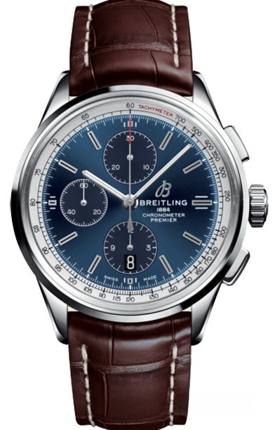 Часы Breitling Premier Chronograph 42 представлены в корпусе из нержавеющей стали размером 42 х 13.8 мм. Внутри корпуса установлен автоматический механизм, Калибр Breitling 13, обладающий запасом хода 48 часов. На синем циферблате отображаются часы, минуты, секунды, дата, тахиметр, накопители хронографа. Часы поставляются на ремешке из кожи аллигатора с вставкой из нержавеющей стали. Водонепроницаемость корпуса составляет 100 метров.