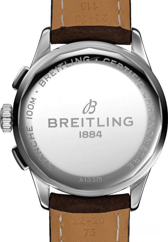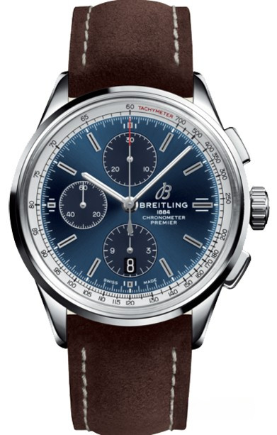 Часы Breitling Premier Chronograph 42 представлены в корпусе из нержавеющей стали размером 42 х 13.8 мм. Внутри корпуса установлен автоматический механизм, Калибр Breitling 13, обладающий запасом хода 48 часов. На синем циферблате отображаются часы, минуты, секунды, дата, тахиметр, накопители хронографа. Часы поставляются на кожаном ремешке с вставкой из нержавеющей стали. Водонепроницаемость корпуса составляет 100 метров.
