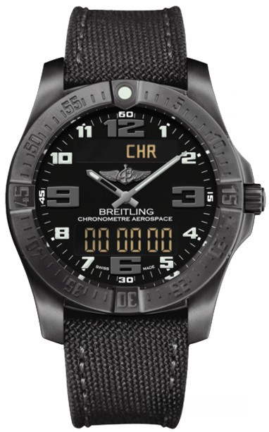 Часы Breitling Professional Aerospace Evo представлены в корпусе из титана с покрытием DLC размером 43 мм и водонепроницаемостью до 100 метров. Внутри корпуса установлен кварцевый механизм, Калибр Breitling 79. На черном циферблате отображаются часы, минуты, секунды, дата, день недели, таймер. Часы комплектуются текстильным ремешком с вставкой из титана.