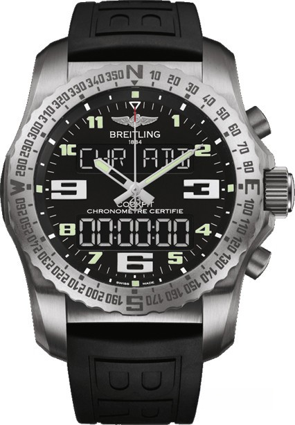 Идеальный инструмент для пилота, многофункциональный электронный хронограф Cockpit B50 отличается титановым корпусом, который оснащен аналоговым и цифровым дисплеями механизма SuperQuartz™, специально разработанного Breitling для авиации. Он создан для сопровождения самых различных миссий, а в число его инноваций входят облегчающий восприятие информации дисплей, высочайшая простота в обращении и широкий набор функций, включающий электронный тахометр и служащее для записи продолжительности полета устройство «хронолет», которое запоминает время и дату вылета и прибытия.
