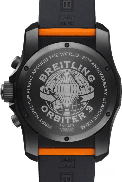 Часы Breitling Professional Cockpit B50 Orbiter Limited Edition представлены в корпусе размером 46 х 16.45 мм из титана с покрытием DLC и водонепроницаемостью до 100 метров. Внутри корпуса установлен кварцевый механизм. На оранжевом циферблате отображаются часы, минуты, секунды, дата, тахиметр. Часы поставляются на каучкковом ремешке с вставкой из титана. Серия ограничена - 213 шт.