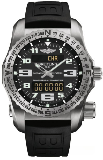 Корпус часов Breitling Professional Emergency Black изготовлен из титана. Диаметр корпуса 51 мм, водонепроницаемость до 50 м. Циферблат черный. На нем отображаются часы, минуты, секунды, дата, день недели. Часы комплектуются кварцевым механизмом. Поставлется на каучуковом ремешке с титановой вставкой.