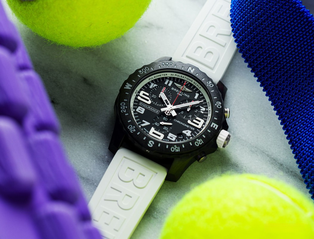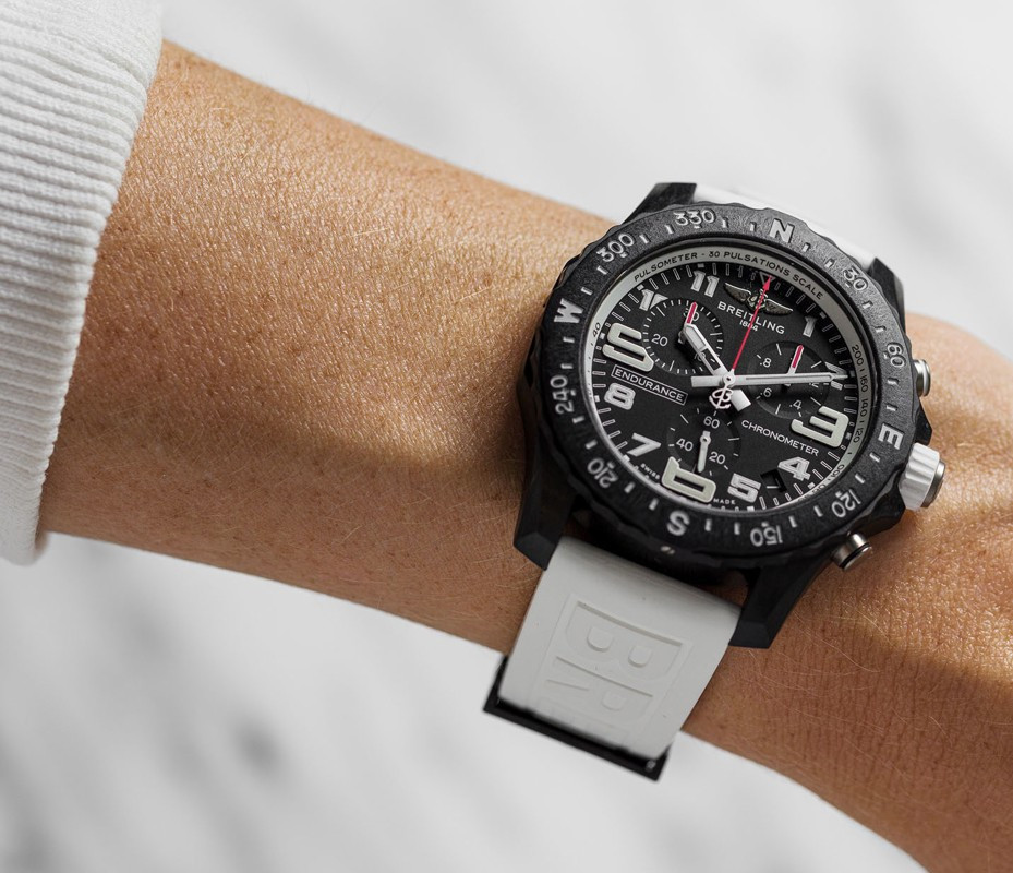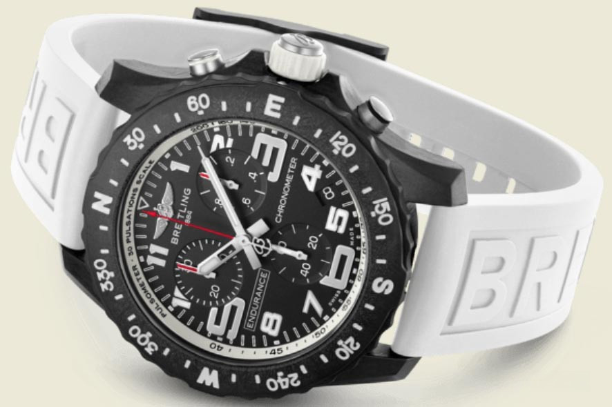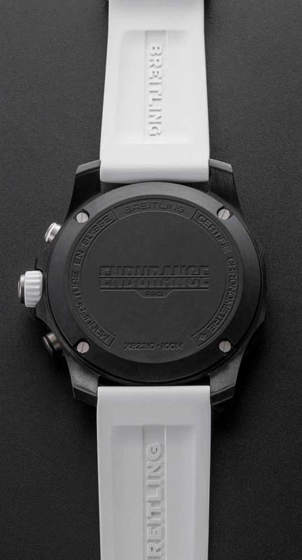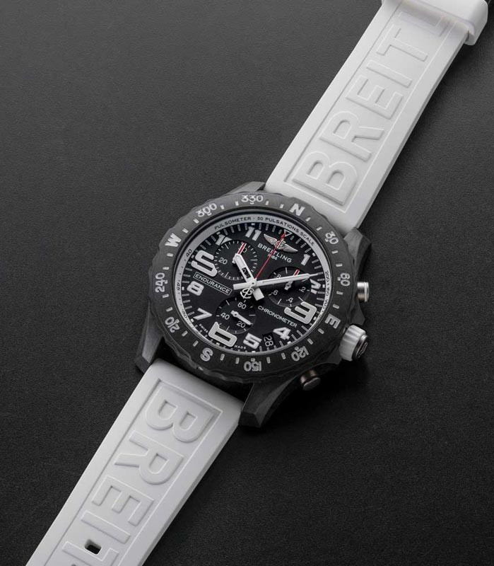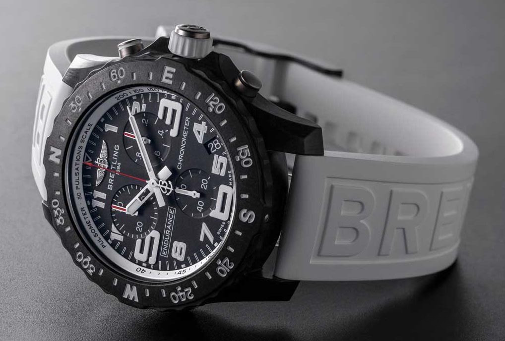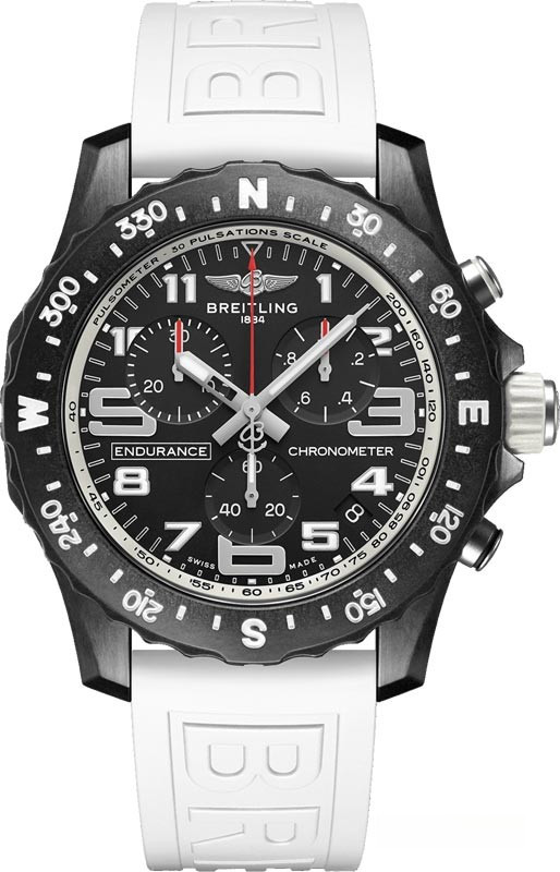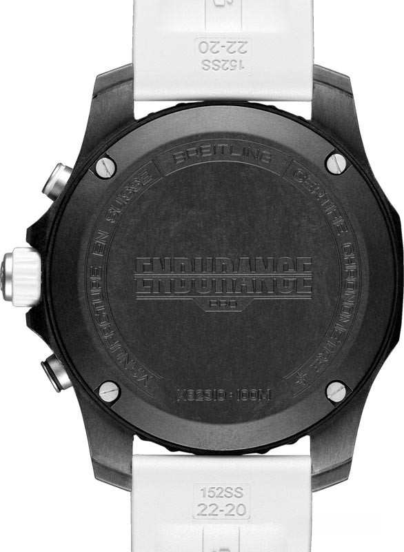 Часы Breitling Professional Endurance Pro представлены в корпусе размером 44 мм из керамики водонепроницаемостью 100 метров. Внутри корпуса установлен суперкварцевый механизм, Калибр Breitling 82. На черном циферблате отображаются часы, минуты, секунды, дата, накопители хронографа, пульсомер. Часы поставляются на каучуковом ремешке с вставкой из нержавеющей стали.