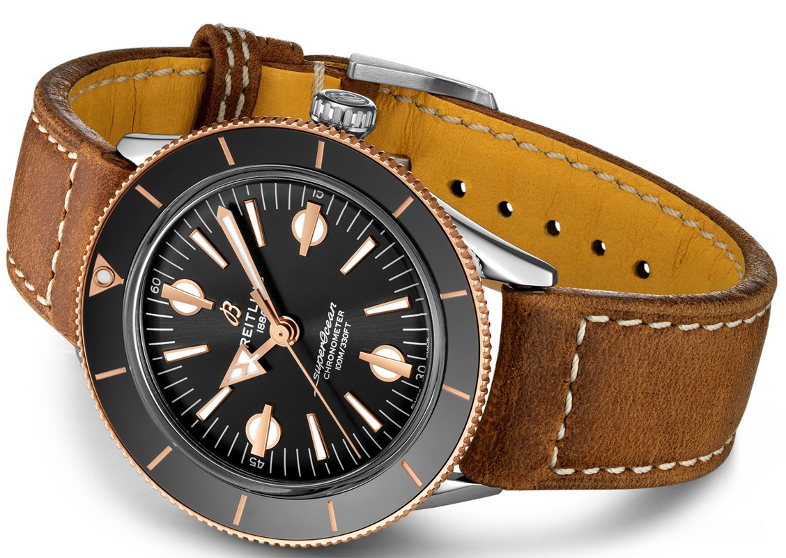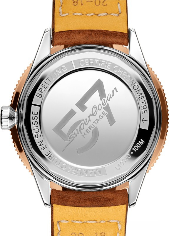 Часы Breitling Superocean Heritage 57 представлены в корпусе из нержавеющей стали и розового золота 18к размером 42 мм и водонепроницаемостью до 100 метров. Внутри корпуса установлен автоматический механизм, Калибр Breitling 10 с запасом хода 42 часа На черном циферблате отображаются часы, минуты, секунды. Часы комплектуются кожаным ремешком с вставкой из нержавеющей стали.