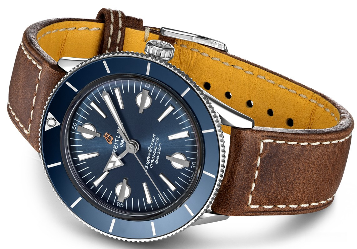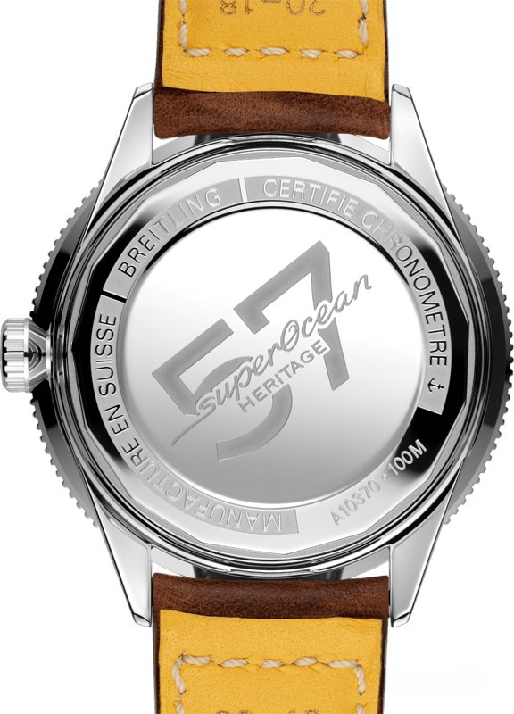 Часы Breitling Superocean Heritage 57 представлены в корпусе из нержавеющей стали размером 42 мм и водонепроницаемостью до 100 метров. Внутри корпуса установлен автоматический механизм, Калибр Breitling 10 с запасом хода 42 часа На синем циферблате отображаются часы, минуты, секунды. Часы комплектуются кожаным ремешком с вставкой из нержавеющей стали.