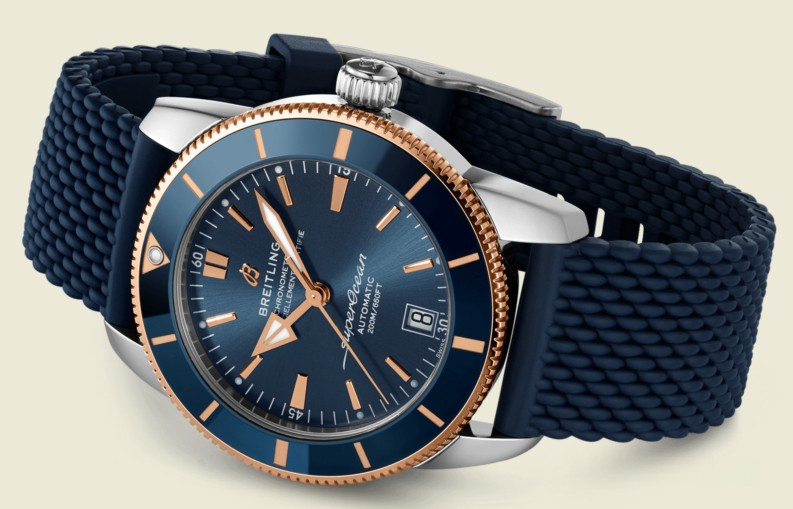 Часы представлены в корпусе размером 42 х 14.35 мм из нержавеющей стали и розового золота 18к с водонепроницаемостью до 200 метров. Внутри корпуса установлен автоматический механизм, обладающий запасом хода 70 часов. На синем циферблате отображаются часы, минуты, секунды, дата. Часы поставляются на каучуковом ремешке с вставкой из нержавеющей стали.