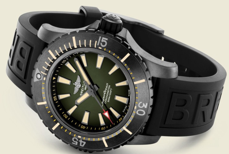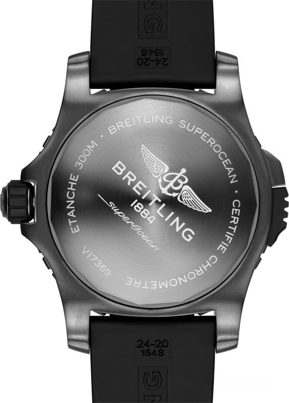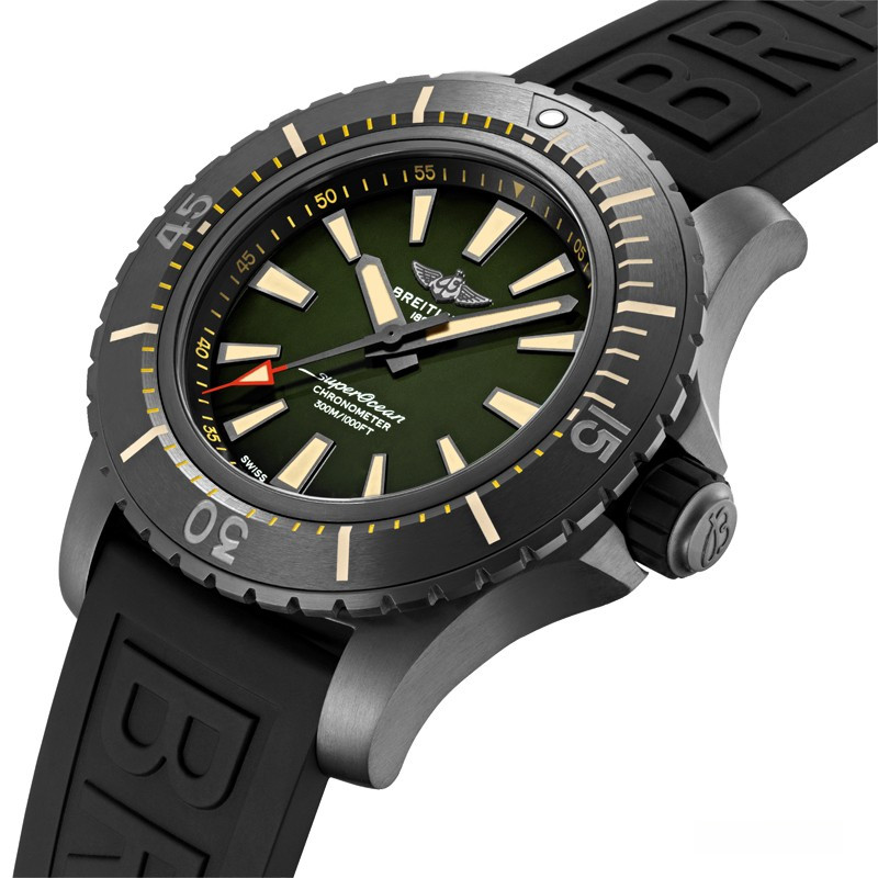 Часы Breitling Superocean Automatic 48 представлены в корпусе из титана размером 48 мм и водонепроницаемостью до 300 метров. Внутри корпуса установлен автоматический механизм, Калибр Breitling 17 с запасом хода 38 часов. На зеленом циферблате отображаются часы, минуты, секунды. Часы комплектуются каучуковым ремешком с вставкой из титана.