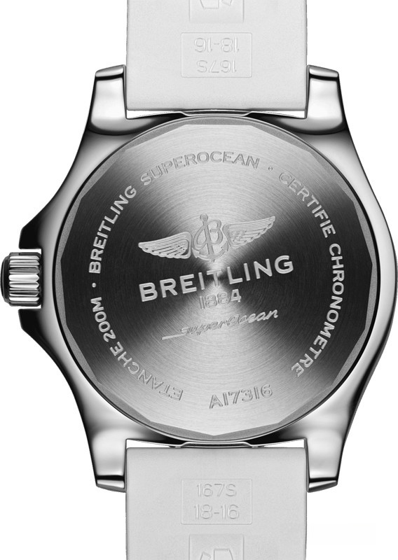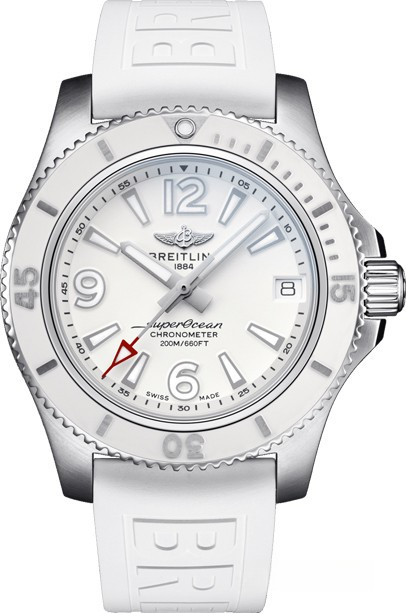 Часы Breitling Superocean Automatic 36 представлены в корпусе размером 36 х 11.25 мм из нержавеющей стали водонепроницаемостью до 200 метров. Внутри корпуса установлен автоматический механизм, Калибр Breitling 17, обладающий запасом хода 38 часов. На белом циферблате отображаются часы, минуты, секунды и дата. Часы поставляются на каучуковом ремешке с вставкой из нержавеющей стали.